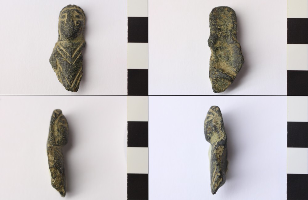 Unter den Stücken befindet sich auch ein bemerkenswerter Bronzefund. Es handelt sich um ein 3,5 cm langes und noch maximal 1,2 cm breites Objekt mit einer menschlichen Darstellung. Zu sehen ist eine halbplastisch ausgearbeitete Figur, die in Höhe der Hüfte abgebrochen ist. Der Kopf mit lockiger, schulterlanger Ponyfrisur hat große eindrucksvolle Augen und eine breite Nase, Kinn- und Mundpartie sind verschliffen. Die Darstellung zeigt ein Gewand mit rundem Kragen und winkligen Verzierungen auf der Vorderseite, die durch doppelte Ritzungen dargestellt sind. Da der linke Arm vollständig und der rechte im Bereich des Oberarms abgebrochen ist, können Ärmel nur grundsätzlich erkannt werden. Sowohl der untere Bereich des Körpers als auch die Beine sind nicht erhalten. Aus diesem Grund kann auch die Gesamtdarstellung nicht erfasst werden. Möglicherweise umfasste die Figur ursprünglich nicht den Bereich unterhalb der Hüfte.