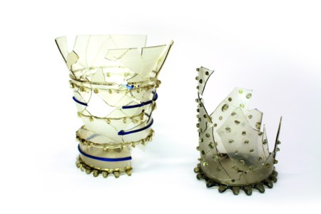 Ganz anders verhält es sich mit Bruchstücke von insgesamt vier Trinkgläsern. Während zwei nur durch Bodenscherben nachweisbar sind, können zwei besser erhaltene Gläser hier vorgestellt werden. Es handelt sich einmal um ein farbloses, zylindrisches Glas mit Standring und Zackenfuß. Über die Gefäßwandung sind zahlreiche kleine Noppen verteilt, ein glatter Trichterhals mit schalenartiger Lippe kann vorausgesetzt werden.