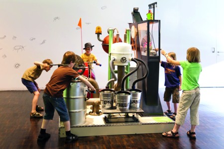 Es wurde schon mal laut im Archäologischen Museum in der Sonderausstellung vom 20. Juni bis 13. September 2015. Es hat gerumpelt, gescheppert und gezischt – denn im Foyer stand die Bodenzaubermaschine. Hier wurde Boden selbst gemacht. Mit großen Steinbrocken fing es an und in mehreren „Arbeitsschritten“ wurden diese zerkleinert, bis nur noch Sand, Schluff und Ton übriggeblieben war. Die ungewöhnliche, 600 kg schwere Konstruktion bildete den Anfang der Sonderausstellung »Bodenschätze«.