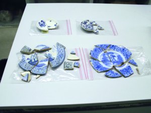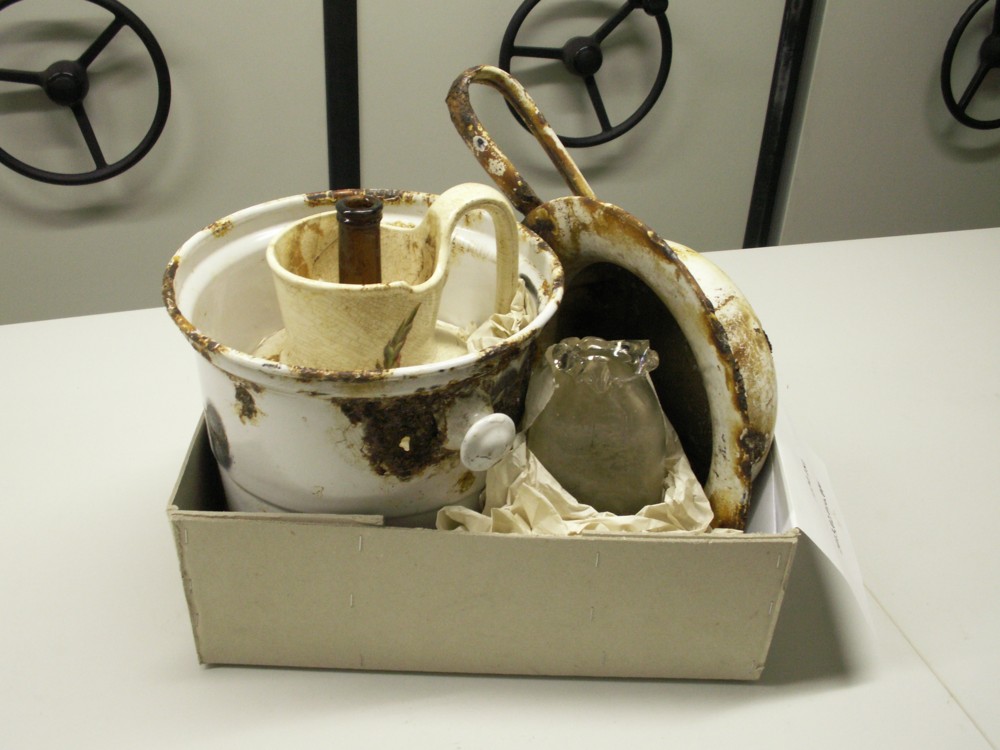 Inzwischen wurden in langwieriger Kleinarbeit „im stillen Kämmerlein“ die zahlreichen mittelalterlichen bis neuzeitlichen Funde der Lieferung von 2013 komplett inventarisiert. Dabei handelte es sich fast ausschließlich um die Inhalte von diversen Latrinen, die neben ihrem eigentlichen Zweck auch zur Entsorgung von allerlei Abfall dienten. Dieser bestand in der Hauptsache aus zerscherbtem Geschirr. Da die Latrinen immer wieder geleert werden mussten, blieben naturgemäß bei bereits im späten Mittelalter gebauten Anlagen nur wenige Scherben aus dieser Zeitstellung erhalten. Der Großteil der Scherben entfiel auf Gefäße der frühen Neuzeit bis hinein ins 20. Jahrhundert und bestand aus glasierten und unglasierten irdenen Töpfen, darunter auch die für die damalige Zeit obligatorischen Nachttöpfe, Siegburger und Westerwälder Steinzeug, rein weiße oder bemalte Fayencen sowie Porzellan.