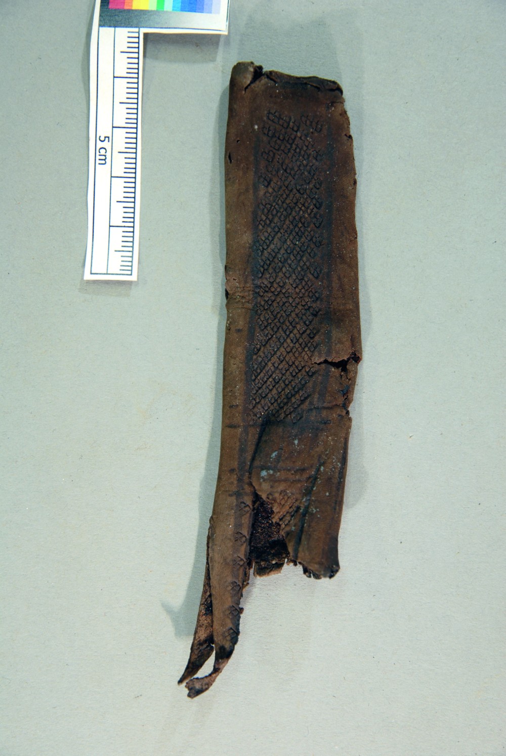 Ein besonderer Fund ist eine aus einem Lederstück gefertigte Messerscheide, die auf der Vorderseite gestempelt ist. Das Werkzeug dazu war ein 4-fach-Stempel, der rautenförmig diagonal eingesetzt wurde. Die Fläche ist durch Längs- und Querlinien, sogenannte Blindlinien, in Felder unterteilt. Mit einem warmen Streicheisen wurden sie in das feuchte Leder eingearbeitet, nach dem Trocknen wirken diese Linien dann dunkler als das nicht behandelte Leder. Die Blindlinien setzen sich teilweise auf der Rückseite fort. Die Spitze des Futterals ist nicht mehr erhalten, an einer Seite ist wohl durch die Messerklinge das Leder aufgeschnitten. Die Nahtlöcher auf der Rückseite sind durch Längsschnitte angefertigt. Am oberen Rand auf Vorder- und Rückseite befinden sich für die Aufhängung je zwei Löcher. Die Länge der Scheide beträgt 13 cm, die Breite 2,8 cm. Als Lederart konnte Rinds- oder Kalbsleder bestimmt werden, letzteres wäre typisch für solche Futterale. Messerscheiden mit stempelverziertem Dekor und geradem Abschluss wurden ab dem 13. Jh. hergestellt.