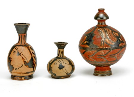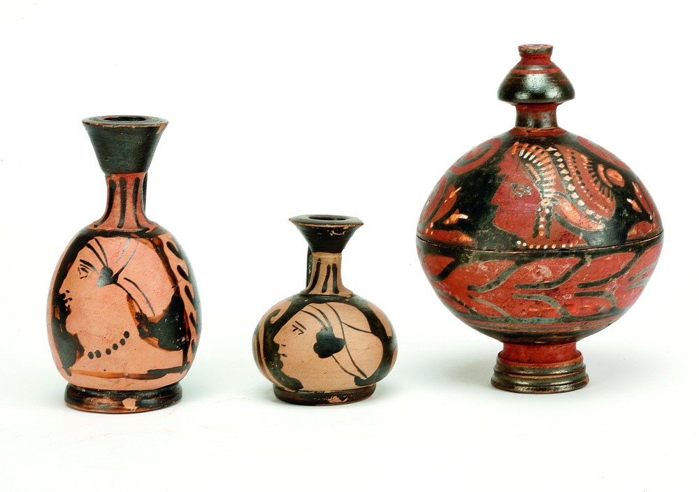 1. Campanische Lekythen und apulische Pyxis (Inv. X 18763. ß 622. ß 644).