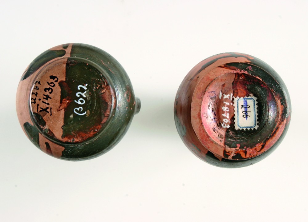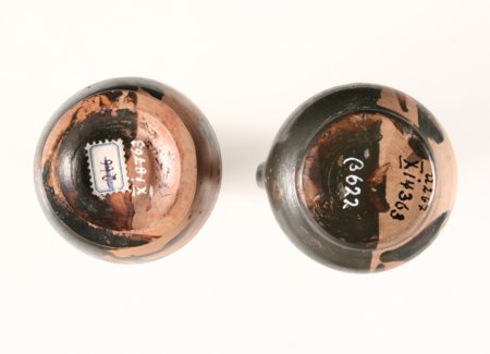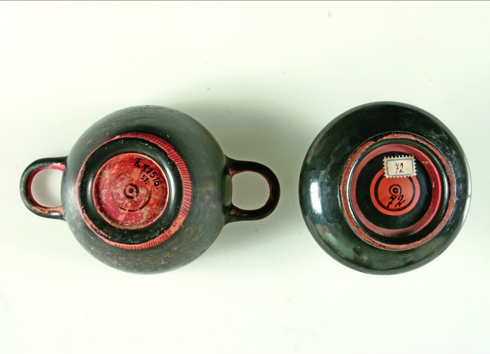 Da Kreisornament und Zeichen absichtsvoll aufgebracht sind, müssen sie von Bedeutung gewesen sein. Allerdings wohl nicht für den Käufer, denn um einen Dekor dürfte es sich kaum handeln. Wahrscheinlicher ist, dass die Kennzeichnung eine Bedeutung für die Keramiker und den Herstellungsprozess der Gefäße hatte. Pyxisober- und -unterteil waren im Brennofen vermutlich an verschiedenen Stellen gestapelt. Dies machte eine Kennzeichnung notwendig, damit nach dem Brand die zusammengehörigen Teile wieder zusammenfanden. Eine ähnliche Funktion, nun aber bezogen auf den Töpfer, dürfte die Kennzeichnung einteiliger Gefäße gehabt haben. Wie in späteren Jahrhunderten schlossen sich auch in der Antike Töpfer zum Gemeinschaftsbrand zusammen. Wenn jeder Töpfer seinen Ofenanteil kennzeichnete, war einer falschen Zuordnung der fertig gebrannten Gefäße vorgebeugt. Dies mag umso wichtiger gewesen sein, je gleicher die Keramiken aussahen. Die in großer Menge hergestellten Lekythen mit Frauenkopf und die lediglich schwarz gedeckten, einander zum Verwechseln ähnlichen unteritalischen Glanztonwaren verlangen eine solche Kennzeichnung geradezu. Es dürfte daher nicht abwegig sein anzunehmen, dass die zur Hälfte mit Glanzton überzogenen Unterseiten unserer beiden Lekythen das Erkennungsmerkmal eines Töpfers für sein Brenngut waren. Jeder Töpfer, der eine Ofenfüllung beschickt hatte, konnte seine Ware auf diese Weise leicht von der seiner Kollegen unterscheiden, und es kam zu keinen Verwechslungen, die für den Töpfer eine finanzielle Einbuße bedeutet hätten.