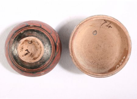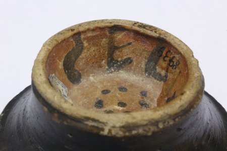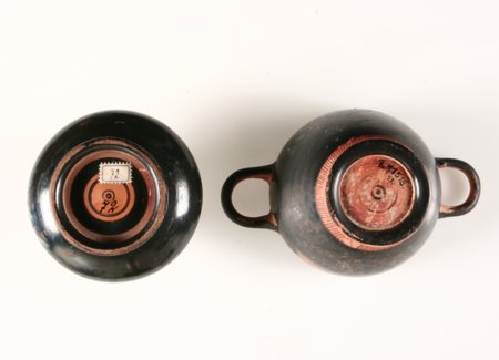 Nichtsdestoweniger sind diese unscheinbaren Seiten manchmal weitaus interessanter als die übrige Gefäßbemalung - so drei kleine, im Magazin aufbewahrte Vasen, zwei Lekythen und eine Pyxis, die alle im letzten Drittel des 4. Jh. v. Chr. getöpfert und in mäßiger Qualität mit dem in Apulien und Campanien bis zum Überdruss wiederholten Göttinnenkopf bemalt sind (Abb. 1). Während die Unterseiten an den meisten unteritalischen Vasen tongrundig belassen sind, ist die Unterseite der beiden campanischen Lekythen sorgsam zur Hälfte mit schwarzem Glanzton gedeckt, was man bei der Vorliebe der Griechen für Symmetrie ungern als Dekor verstehen möchte (Abb. 2). Wenn Unterseiten dekoriert sind, dann sieht man, wie an zwei Glanztonkeramiken attischer Provenienz, sauber zentrierte Kreismuster (Abb. 3). Ein solches Kreisornament entdeckt man auch an der apulischen Pyxis, sowohl im Inneren des Deckels als auch an der Unterseite des Büchsenteils, jedoch seltsam aus der Mitte verschoben und jeweils von zwei buchstabenähnlichen Zeichen begleitet (Abb. 4). Eine solche Buchstabenkennzeichnung findet sich hin und wieder auch an campanischer Glanztonware (Abb. 5).